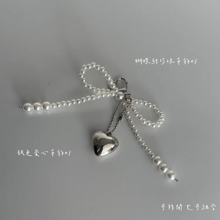 蝴蝶結吊飾組含珍珠蝴蝶結*1 銀色愛心吊飾*1